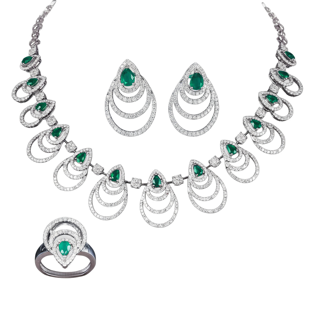 This jewelry set is a stunning display of elegance and craftsmanship, designed in white gold and encrusted with brilliant white diamonds. Each piece features a teardrop motif, centered around a vivid green gemstone, likely emerald, that adds a rich pop of color and regal charm.